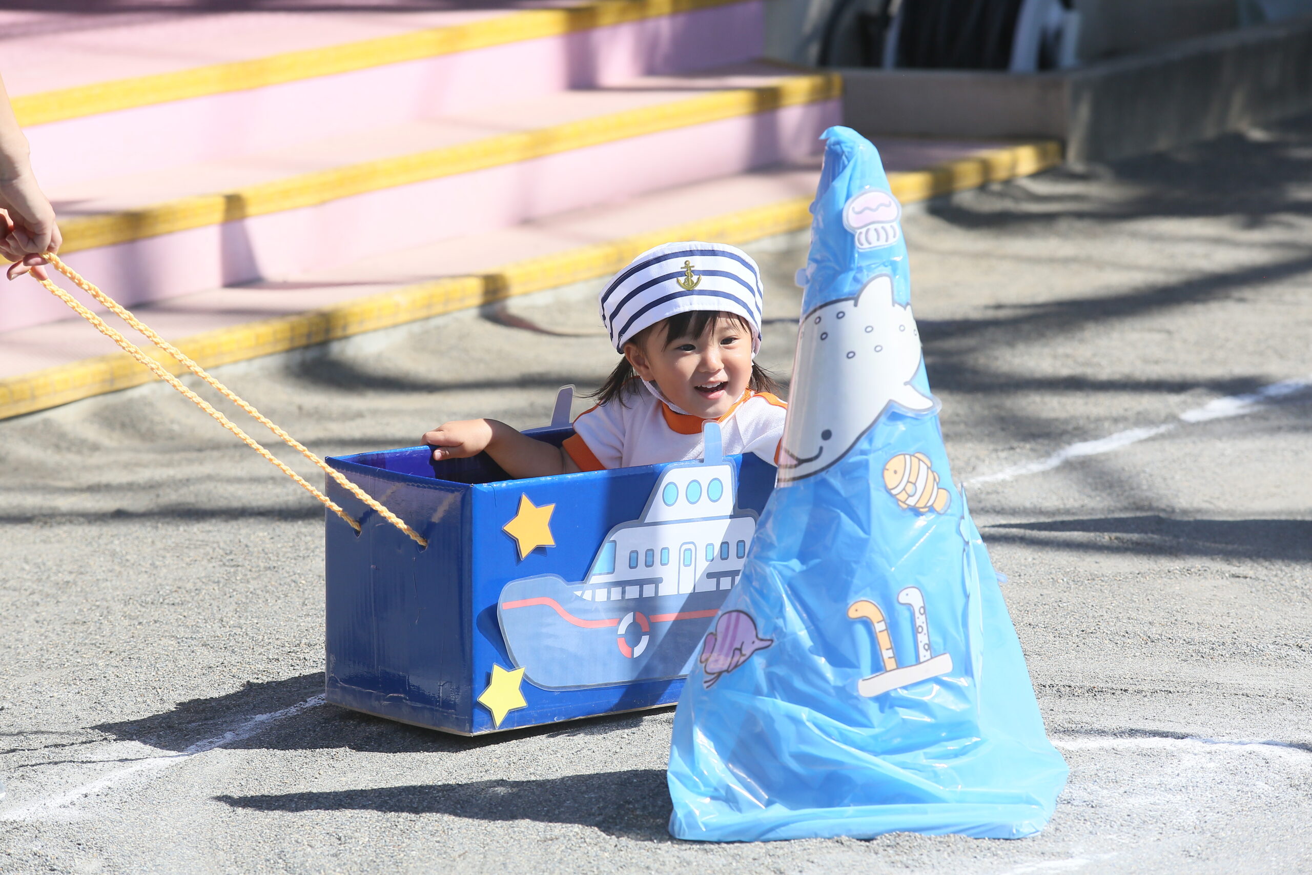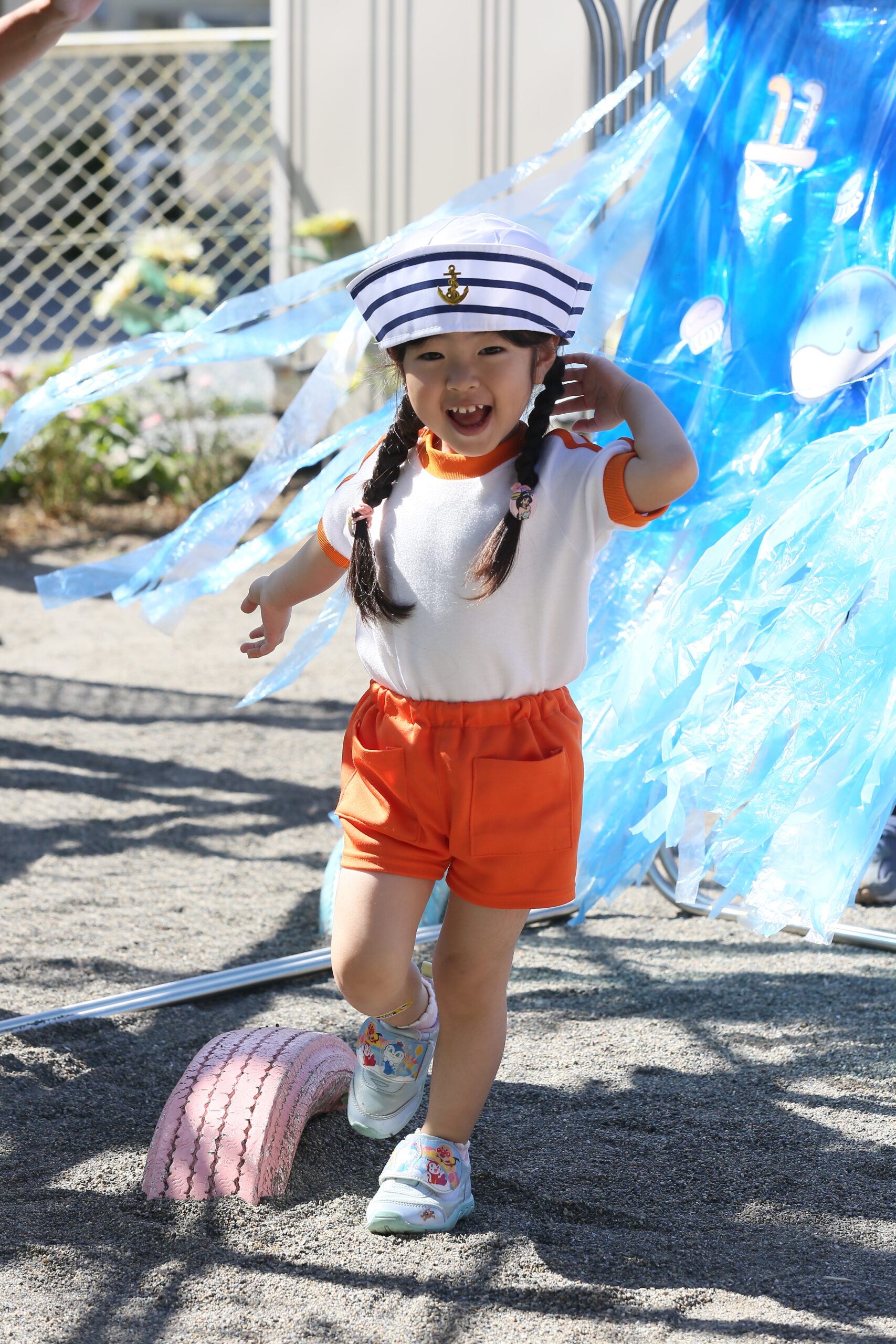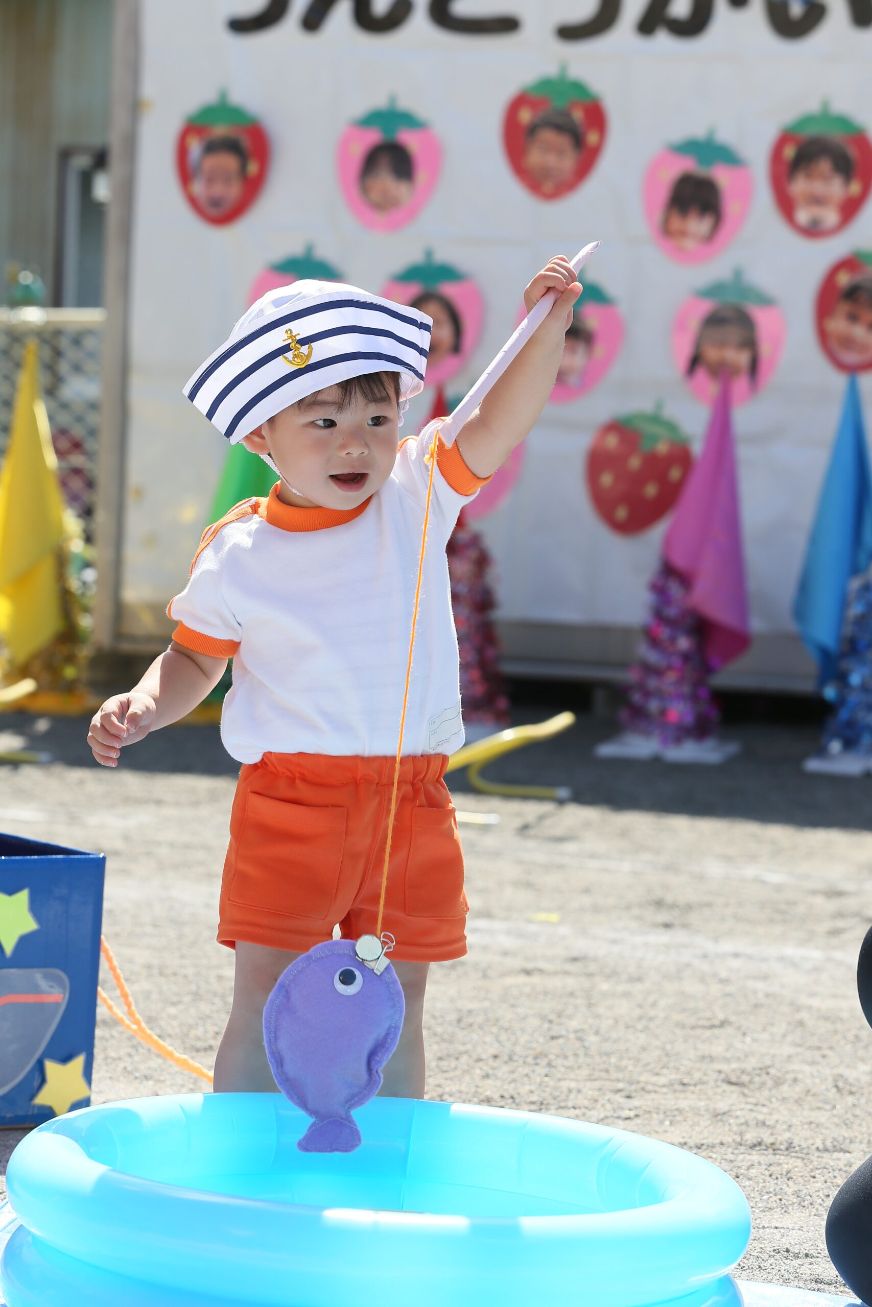 運動会② お知らせ 2025.10.102025.12.01 一つ目の障害走は、ザブザブ海の大冒険です!海のカーテンをくぐったり、船に乗って冒険に出かけます。最後に好きな色のお魚を釣ってゴールです!みんな上手にお魚を釣ることができました✨