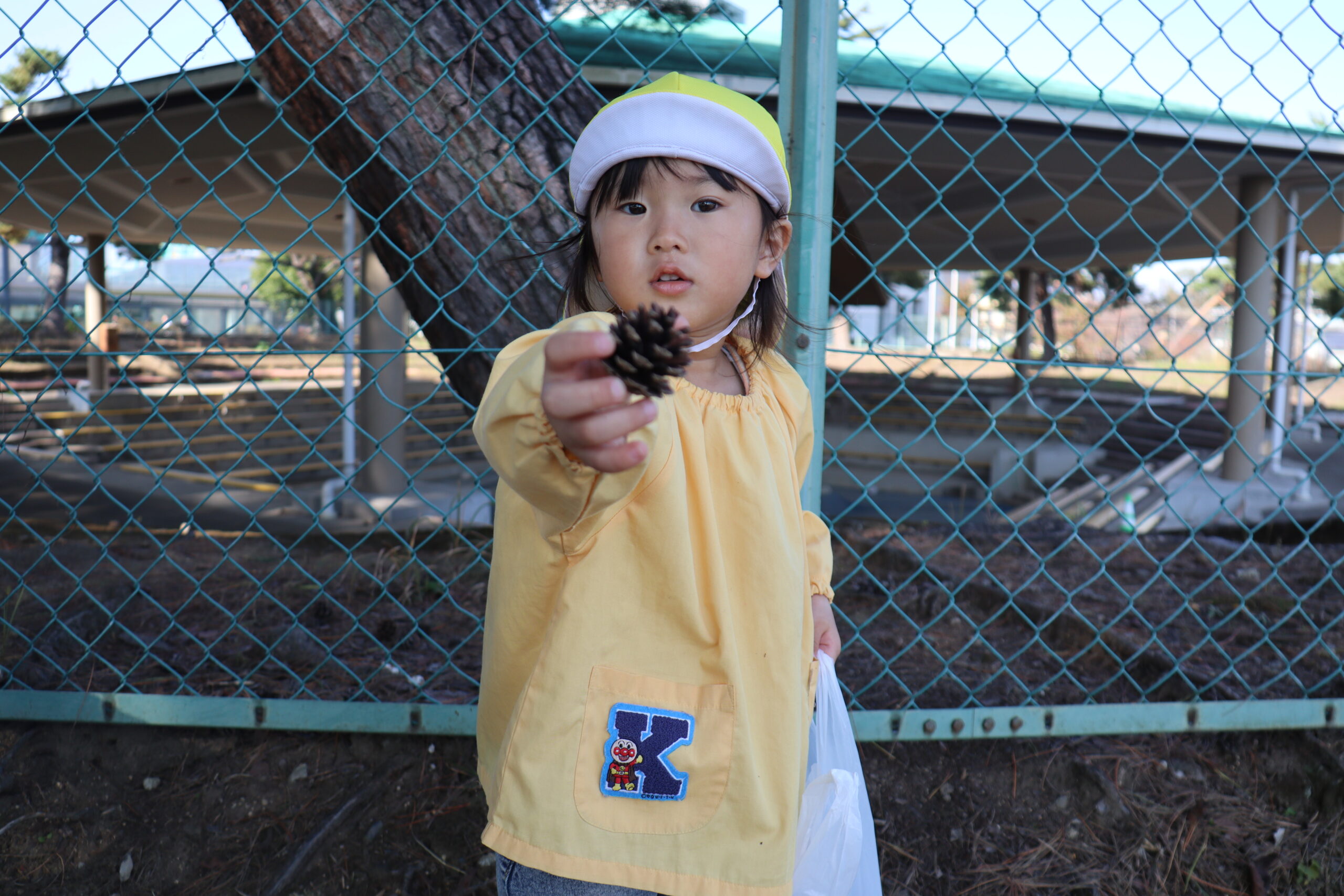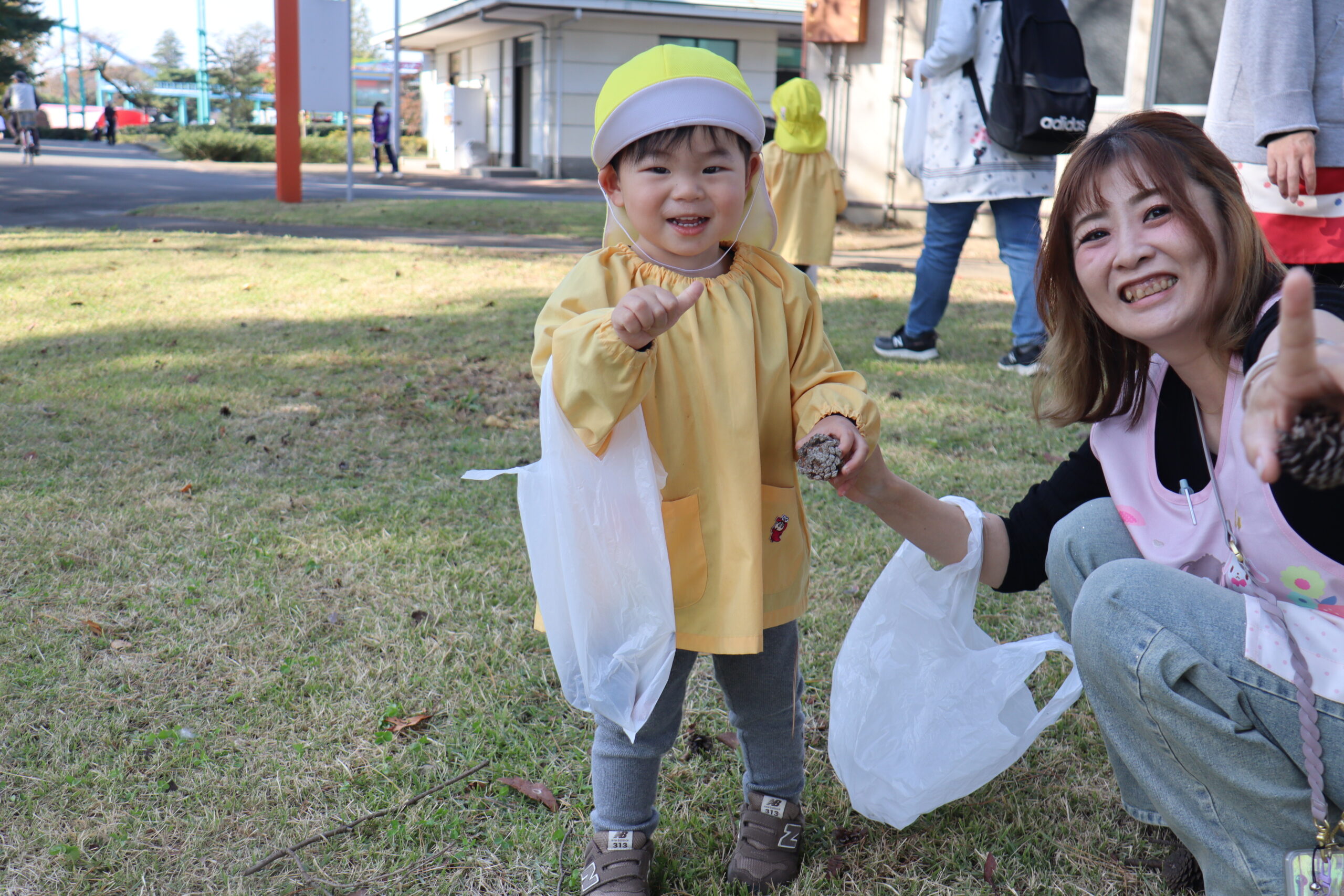 さわやかな秋晴れの中、とちのきファミリーランドのお隣にある水生植物園へ遠足に出かけました。公園に着くと、高校生のお兄さんお姉さんがマラソンをしていたので『がんばれ~』とパチパチしながら応援しました。その後は、待ちにまったどんぐりとまつぼっくり拾いです!見つけると『あったよ~』と嬉しそうに見せてくれました。自分の袋にいっぱい拾いましたよ😊