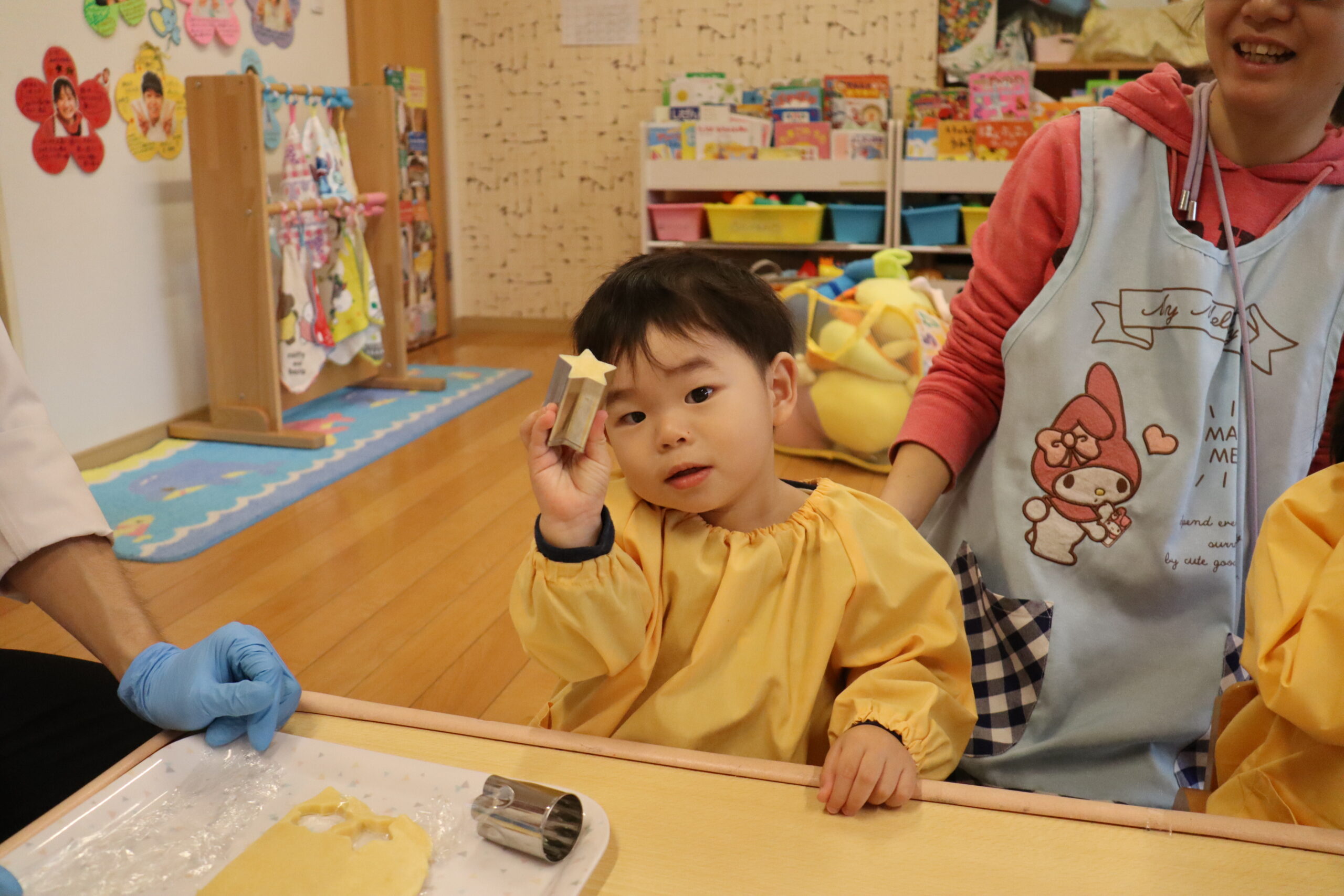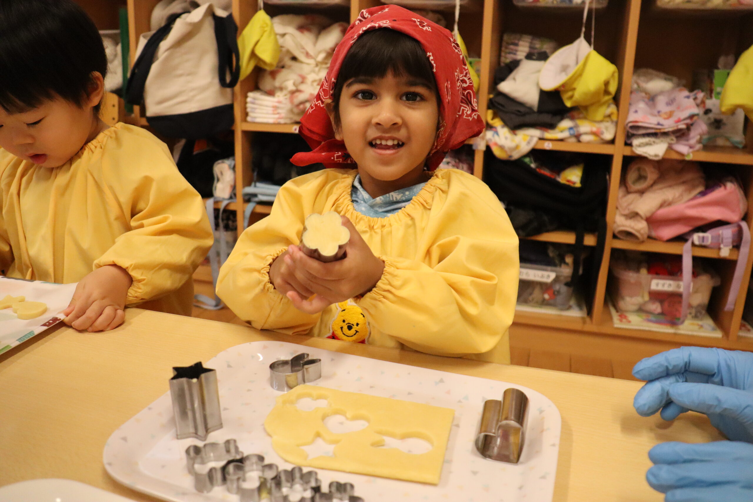 後半は、にじぐみさんがクッキー作りをしました。頭には三角巾(頭おおい)を被って準備万端な子どもたち🌟一人ずつ伸ばした生地を配ると、子どもたちはそれぞれ好きなクッキーの型を選び、型を生地に押し当ててどんどんクッキーを作っていきました。作っているときの顔はとても真剣な表情でしたが『作ったクッキー見せて~』というと、笑顔になり『私はハート💛』『僕はほしだよ~🌟』と得意気な表情で見せてくれたにじぐみさんでした!!