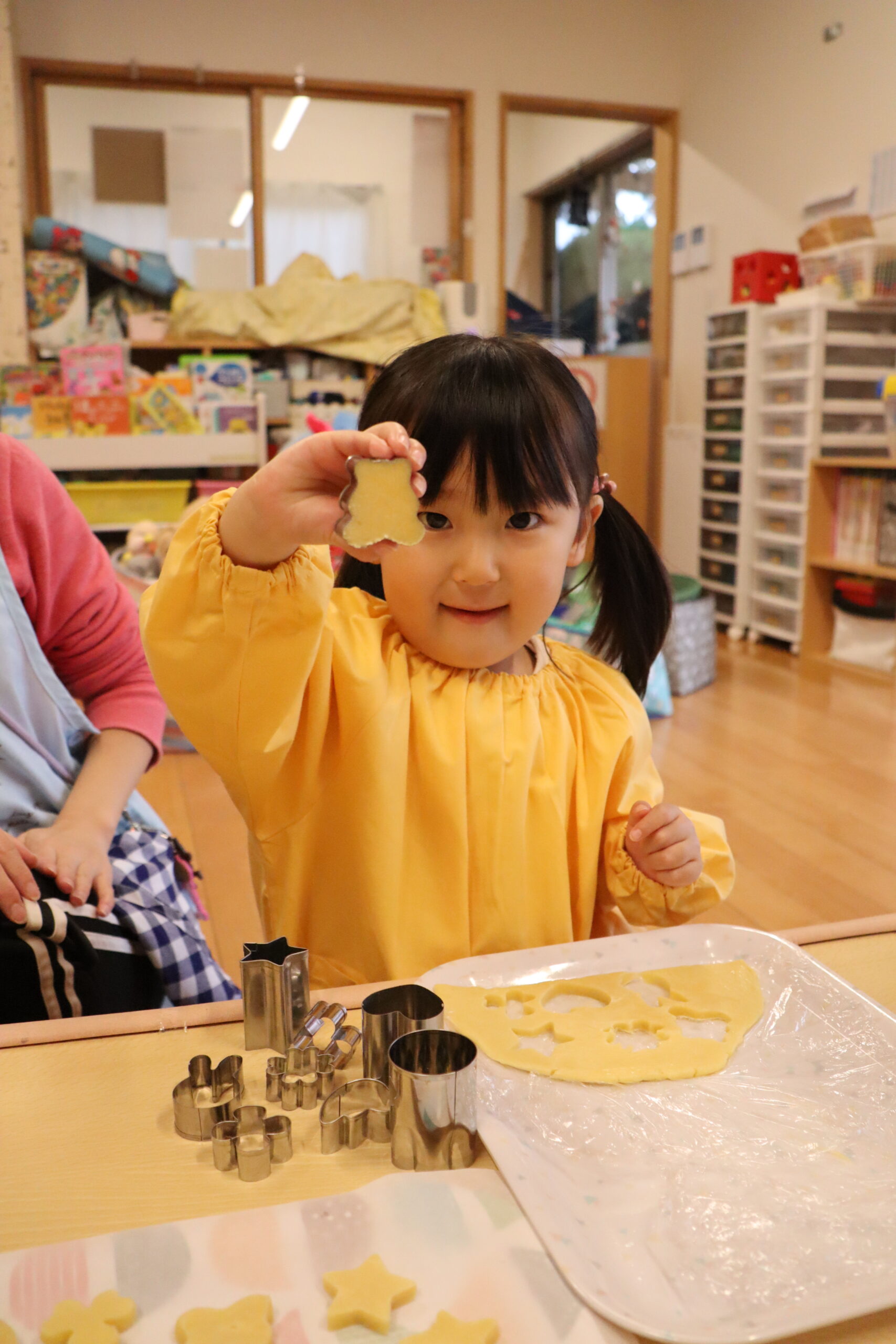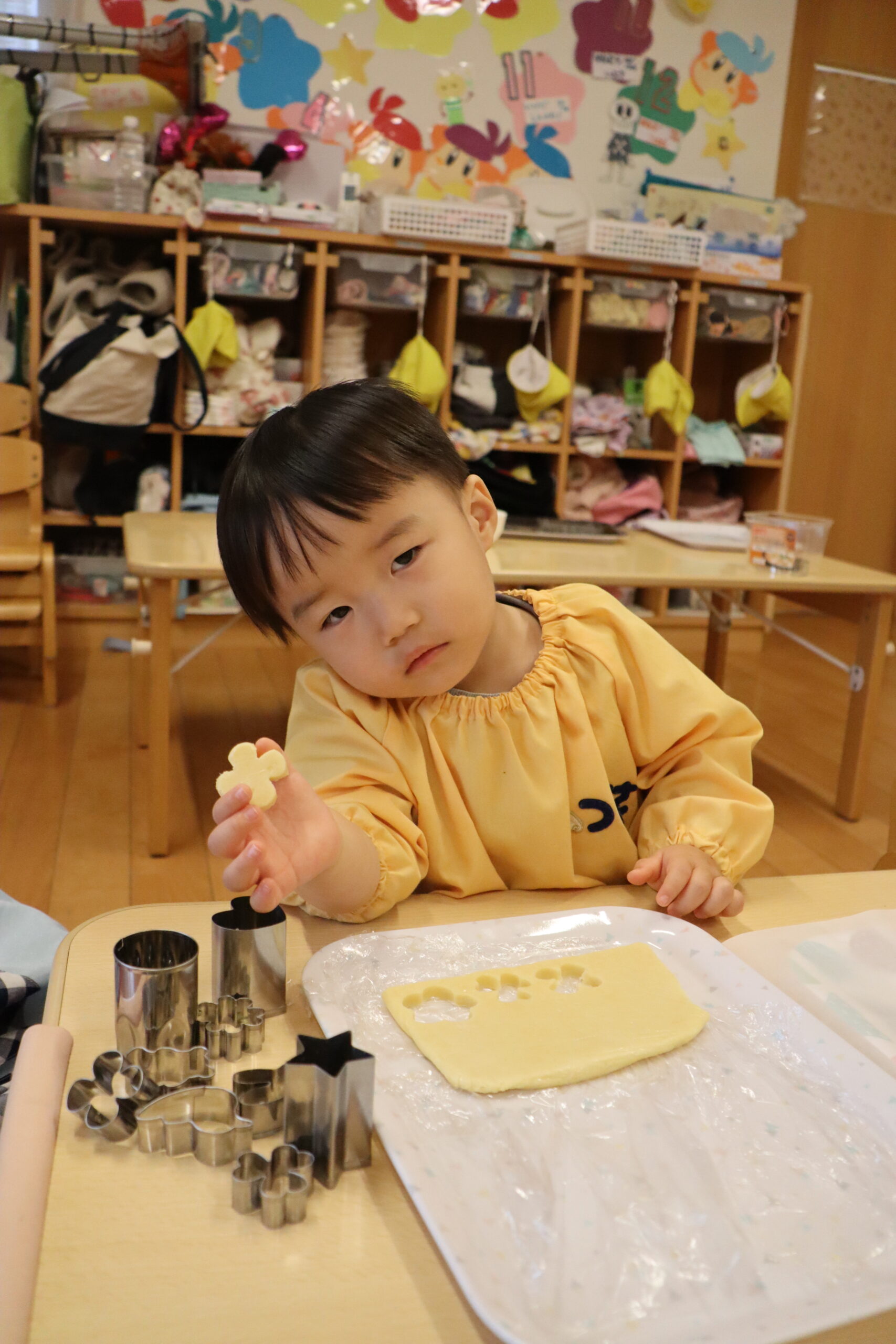 子どもたちは好きなクッキーの型を選ぶと。生地の上に型を置いて手を広げて上から”ギュー”と力を入れて型抜きをしました。『見せて?』と声をかけると嬉しそうに見せてくれました。