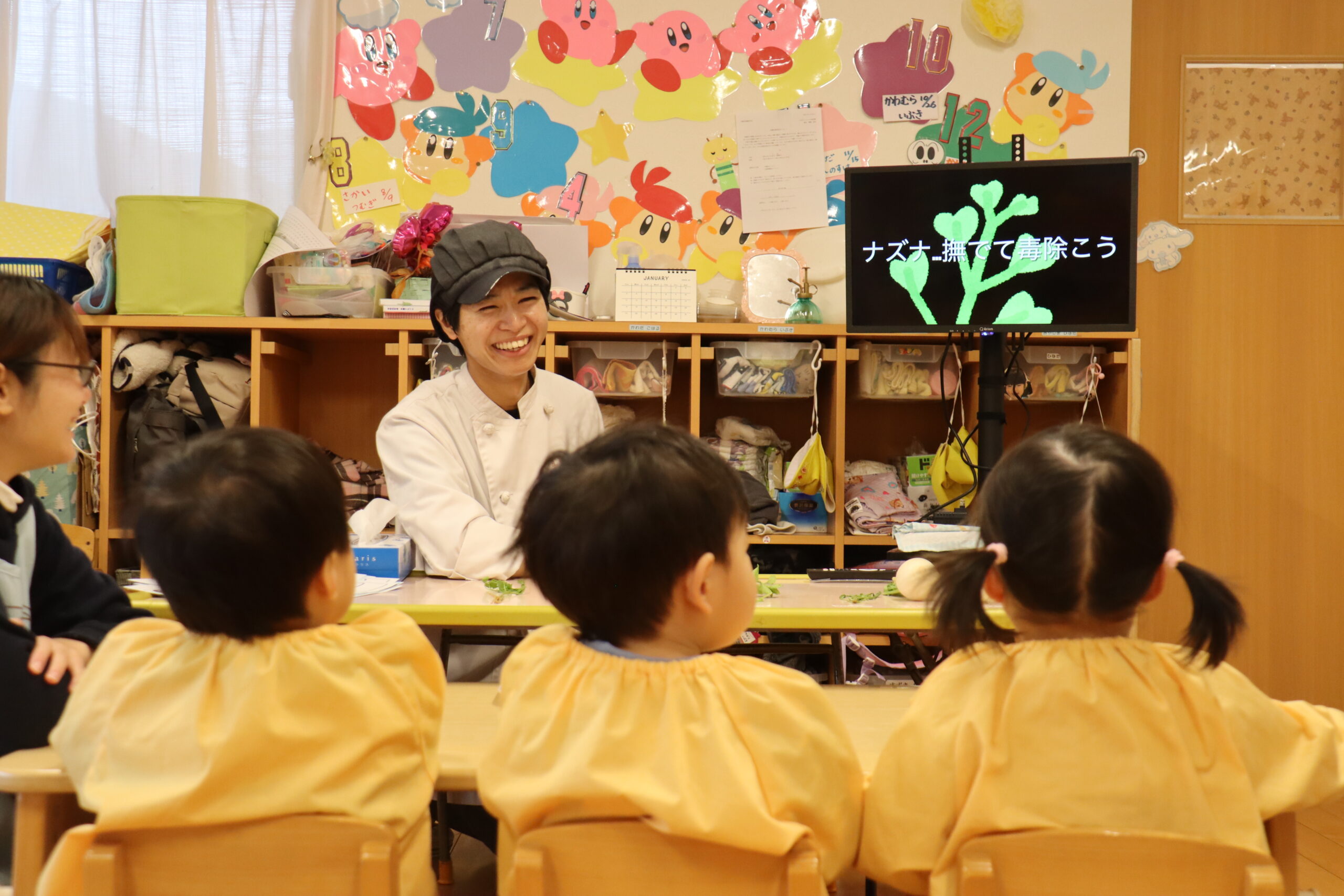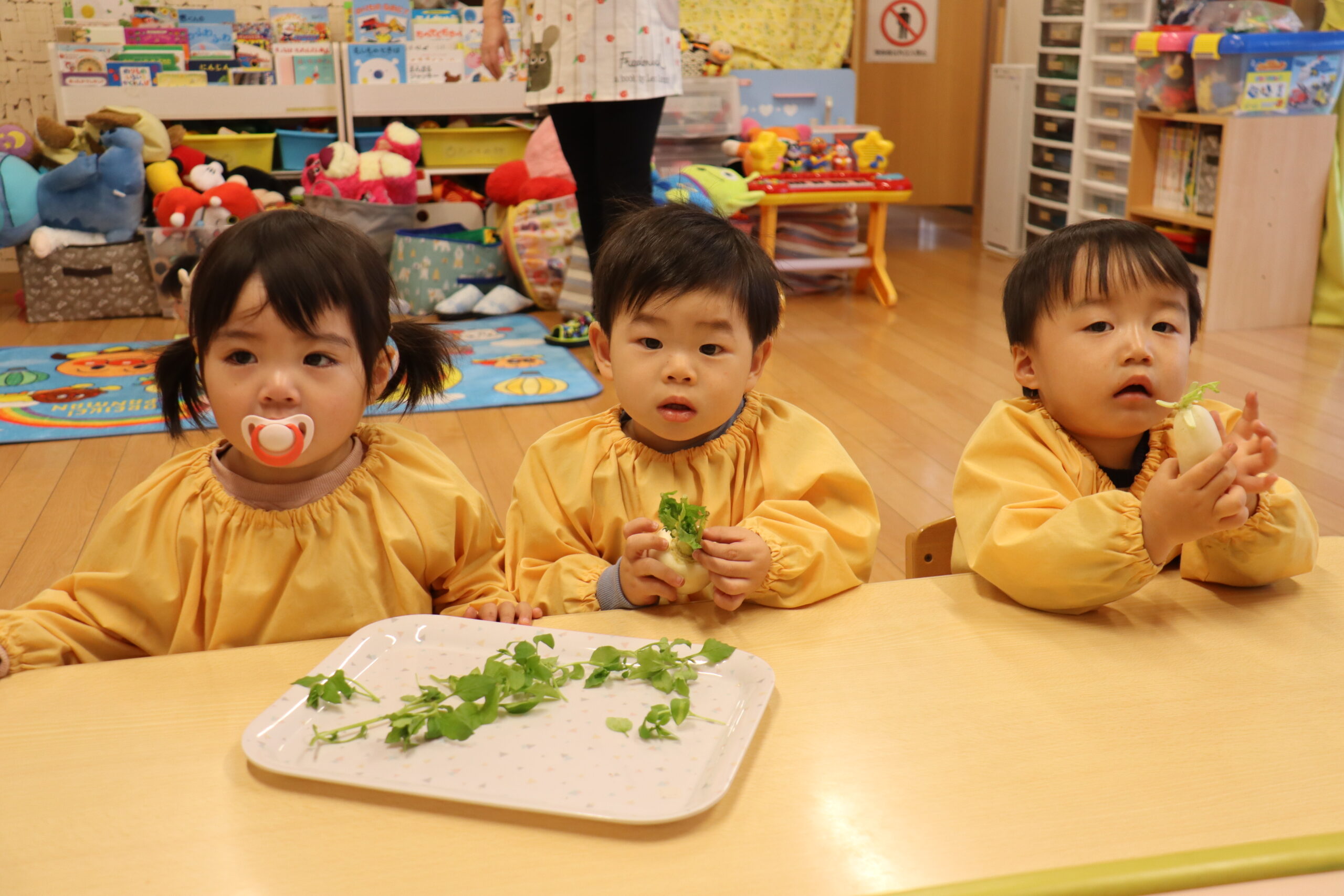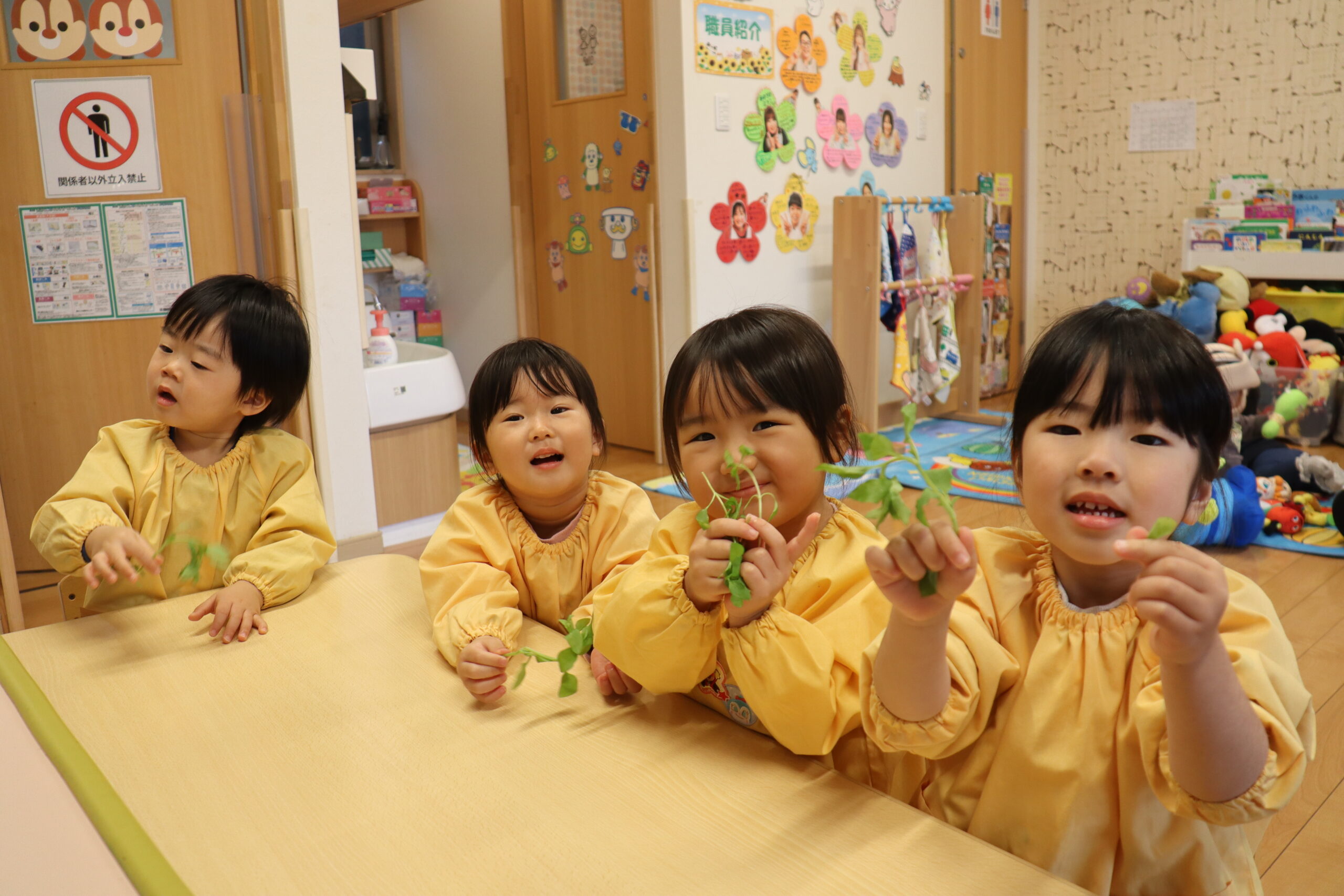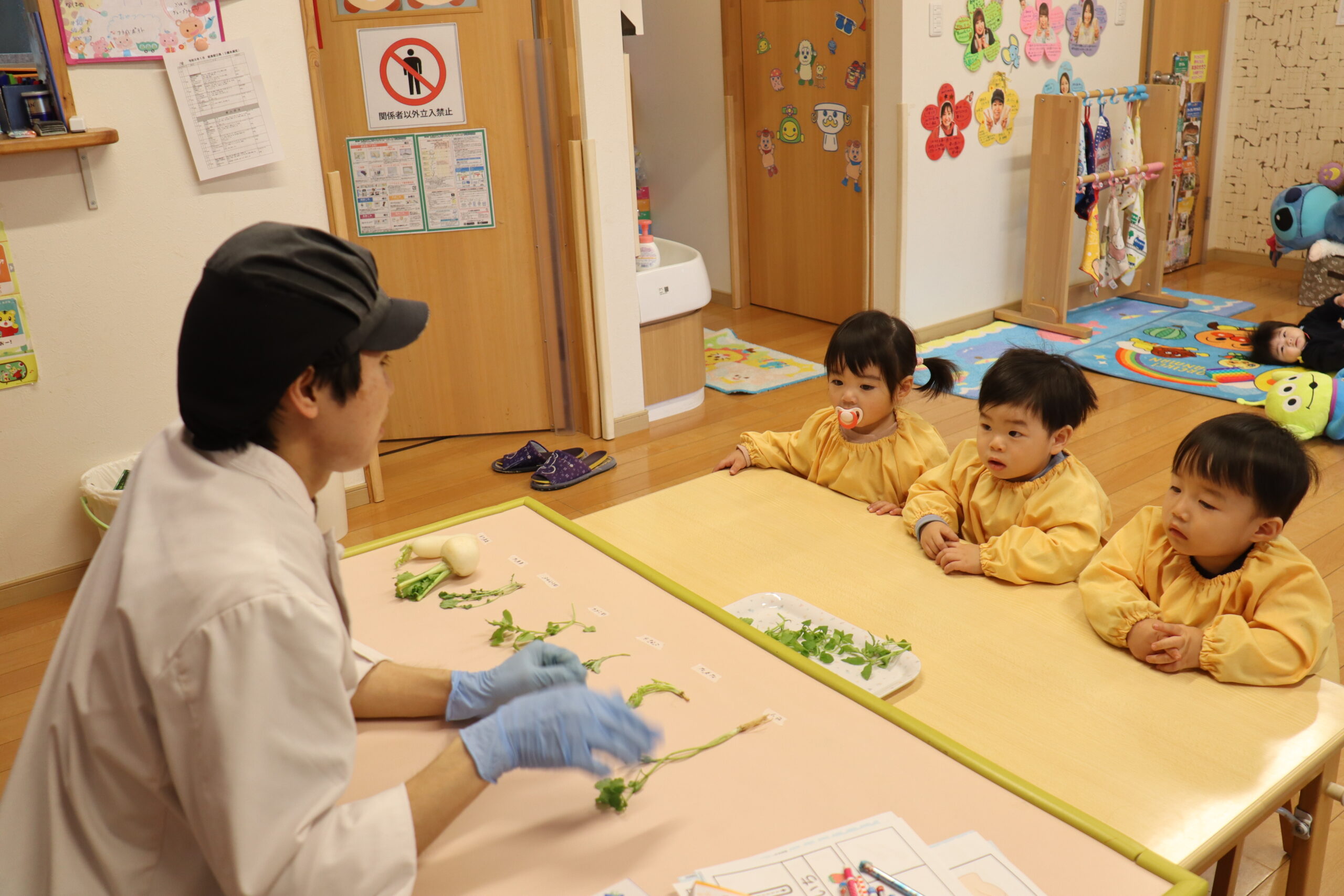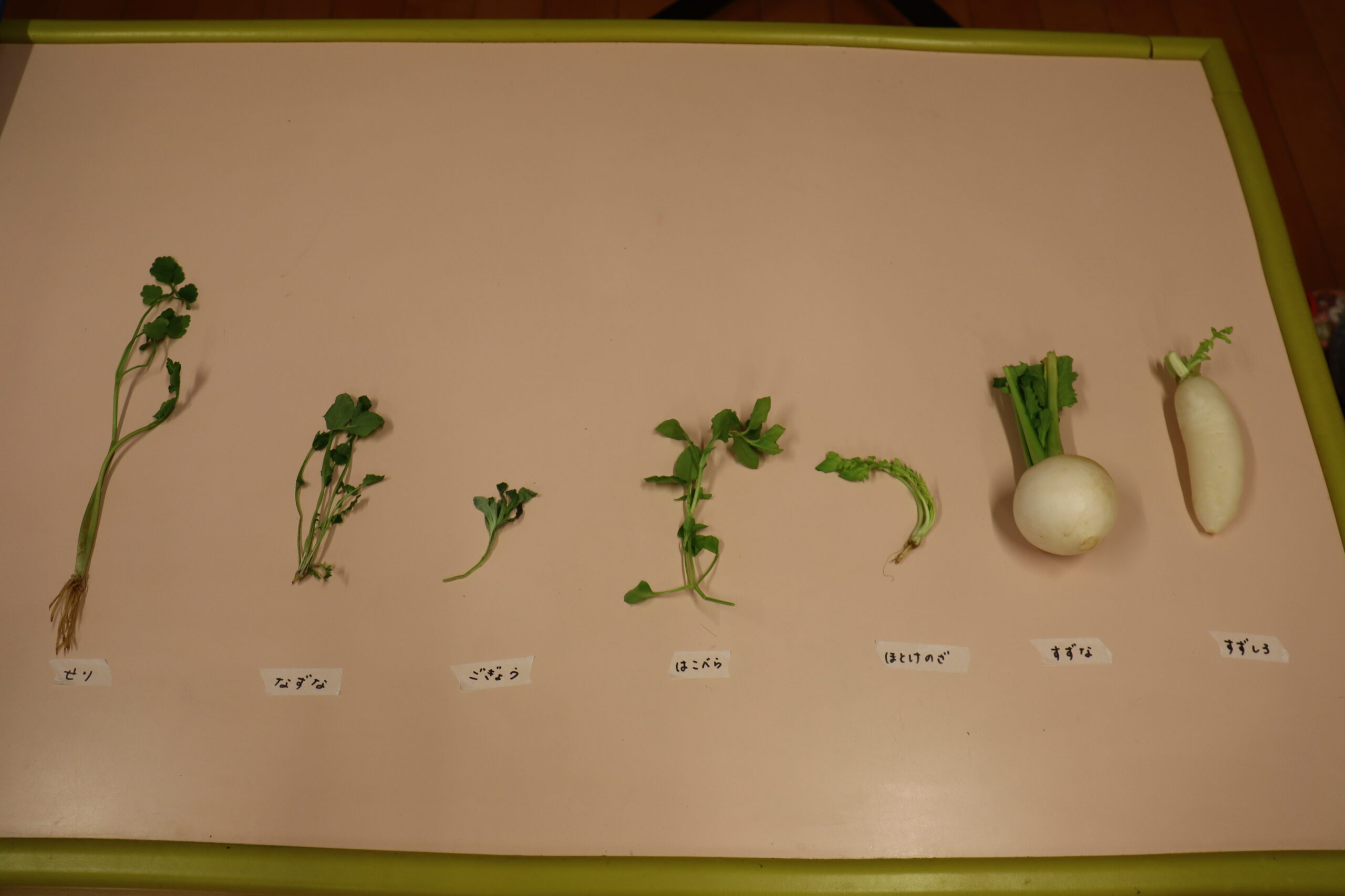 七草粥 お知らせ 2026.01.072026.02.13 今日は「七草粥」について食育を行いました。栄養士さんが七草粥について話をすると、真剣な表情で話を聞く子どもたち。 『食べられるの~?』『じゅんばんでたべるの~?』と積極的に質問したりと興味津々!!実際に七草を触って感触や匂いを確かめたり、七草の種類を一つひとつ声に出して名前を覚えました😊午後のおやつは七草粥を食べ、みんなが1年間元気に過ごせるようお願いをしながら美味しくいただきました!!